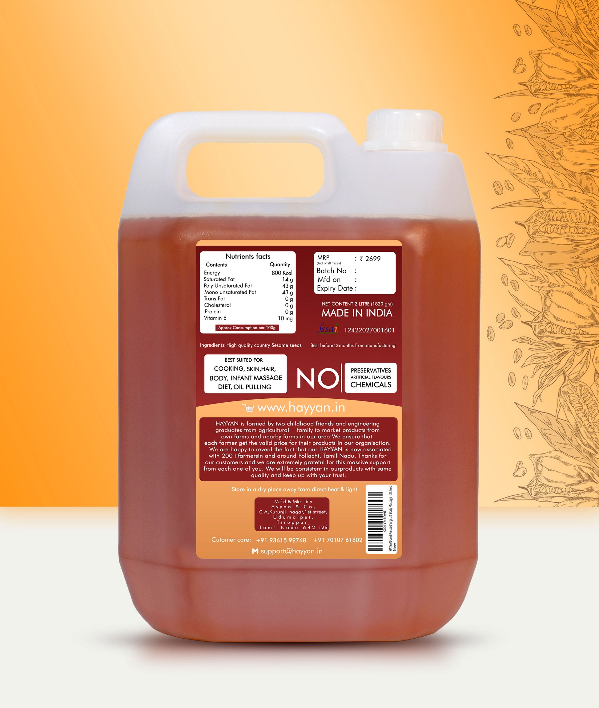HAYYAN Cold Pressed Sesame Oil / Gingelly Oil / Til Ka Oil - 5 Litre